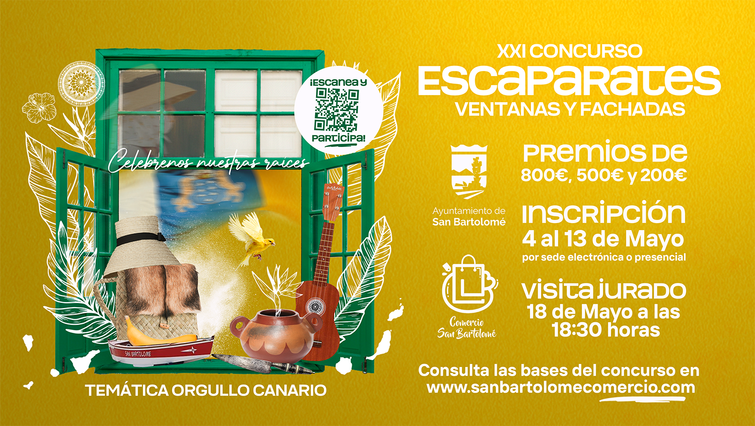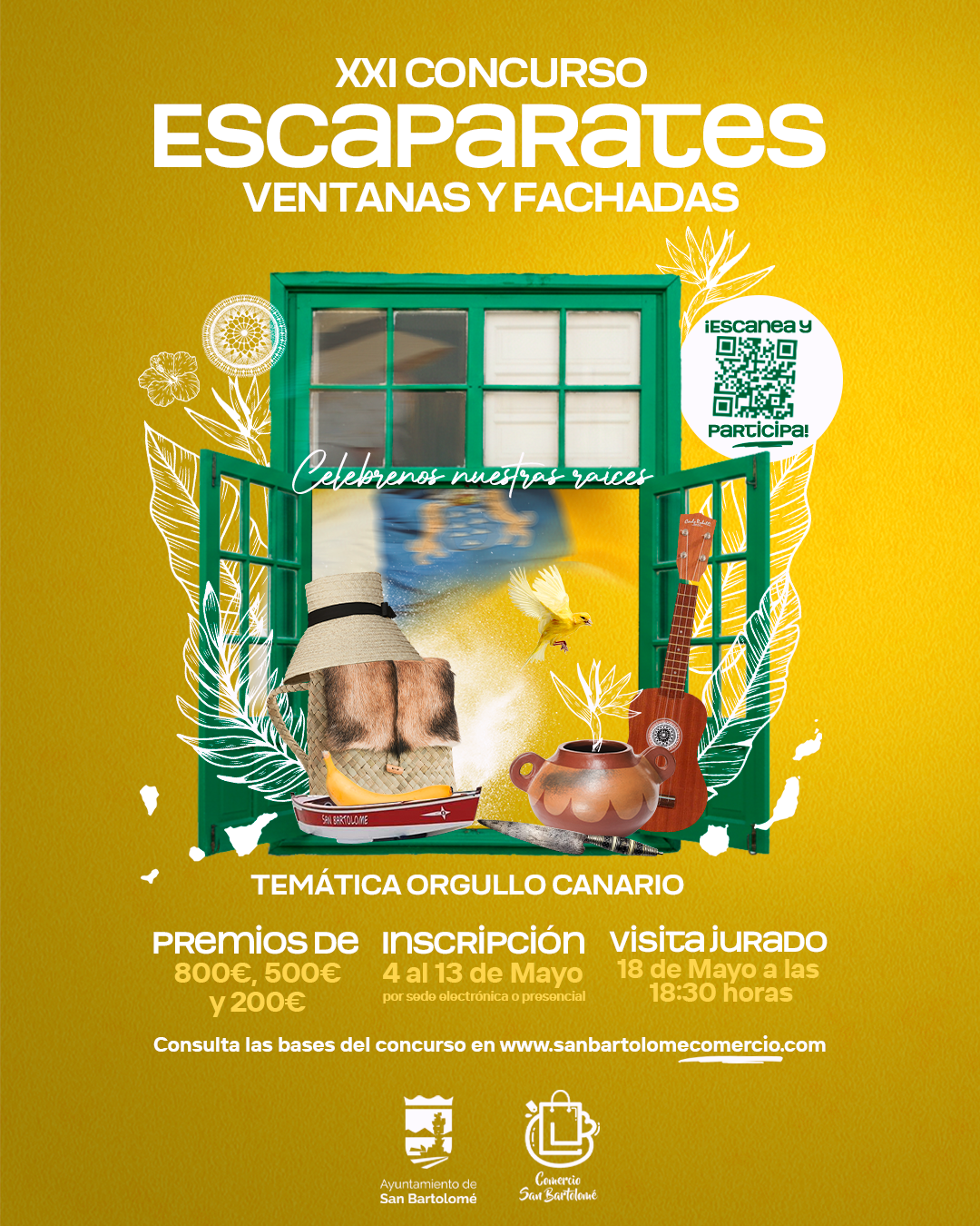 Para poder participar en el concurso, es necesario presentar la Hoja de Inscripción, que se adjunta a las bases, entre el lunes 4 de mayo al miércoles 13 de mayo de 2026, ambos inclusive, en el Registro Municipal de este Ayuntamiento, o por la Sede Electrónica del Ayuntamiento de San Bartolomé, se le entregará la pegatina con el código QR de acreditación de comercio concursante. La participación en el concurso supone la aceptación de las Bases del mismo. Se publicará en el tablón de anuncio de la página Web de este Ayuntamiento www.sanbartolome.es